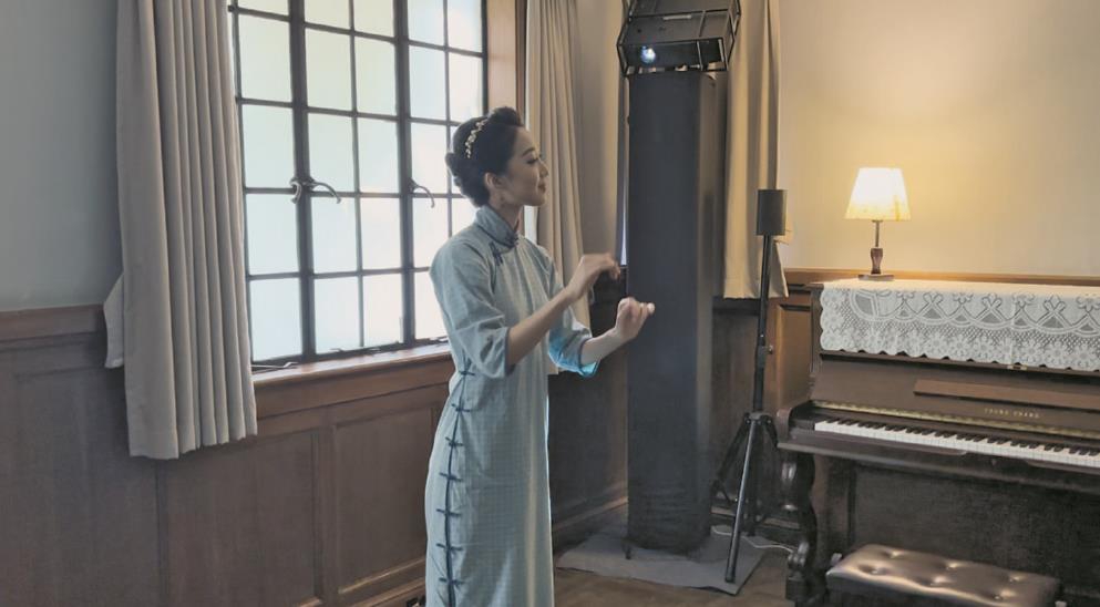 迈进夏衍旧居的马蹄形门洞,夏衍的文字铺满前厅的天花板与主墙面,其所作《野草》的诵读声响起,这样一道声音景观引人们进入一场轻巧别样的沉浸式体验。客厅的留声机中响起舞曲,一支《梧桐影韵》引用了上海老歌的流行曲风,词曲却是全新创作,讲述了对这片充满历史记忆和音乐底蕴的城市街区的回忆。原来,这部作品由上海国际数字音乐周艺术总监、作曲家,上海音乐学院安栋教授领衔担纲创作,携手上音数媒学院的戴维一副教授、董天晟,以及音工系房大磊副教授、音乐剧系的马良导演、上海工程技术大学蔡张蔺等青年教师共同主创。融合人工智能(AI)和扩展现实(XR)等前沿科技,将上海的城市文化记忆以全新的方式活态呈现。