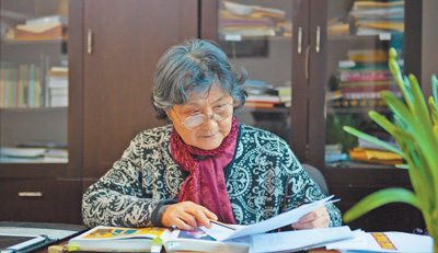 图为钱小萍正在审阅设计稿。