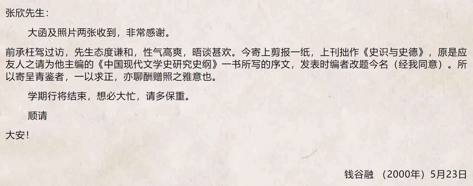 介绍钱谷融教授的这期“学人侧影”专栏,就用上了钱先生随信附来的那篇《史识与史德》,另有一篇我写的访问记《华师二村访钱谷融先生》。刊物印出后,我即寄给钱先生一册,这时已是第二年新学期开始之际,距离我上一年拜访老人家已近一年了。