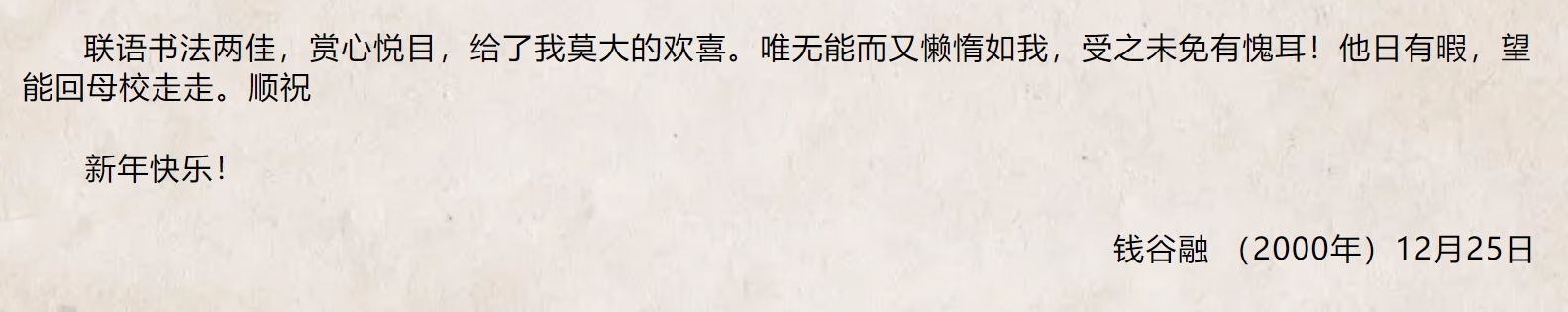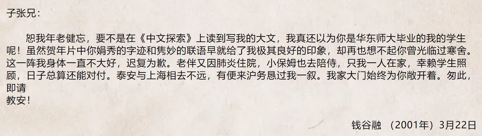 只是由“他日有暇,望能回母校走走”一语,可知钱先生把我误认为华东师大毕业的学生了。耄耋之年的钱先生门生众多,我想这恐怕也难免。