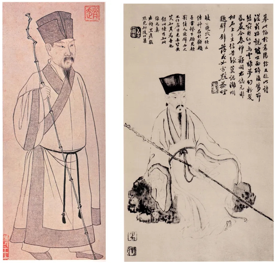 左图为图九:苏轼(赵孟頫绘),右图为图十:苏轼(宋代李公麟绘,清代朱野云临摹)