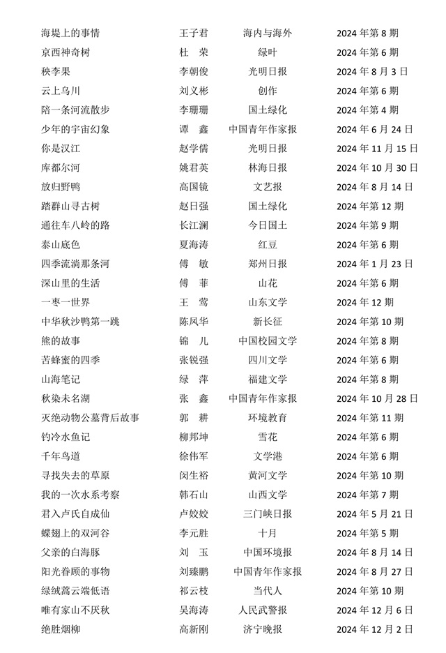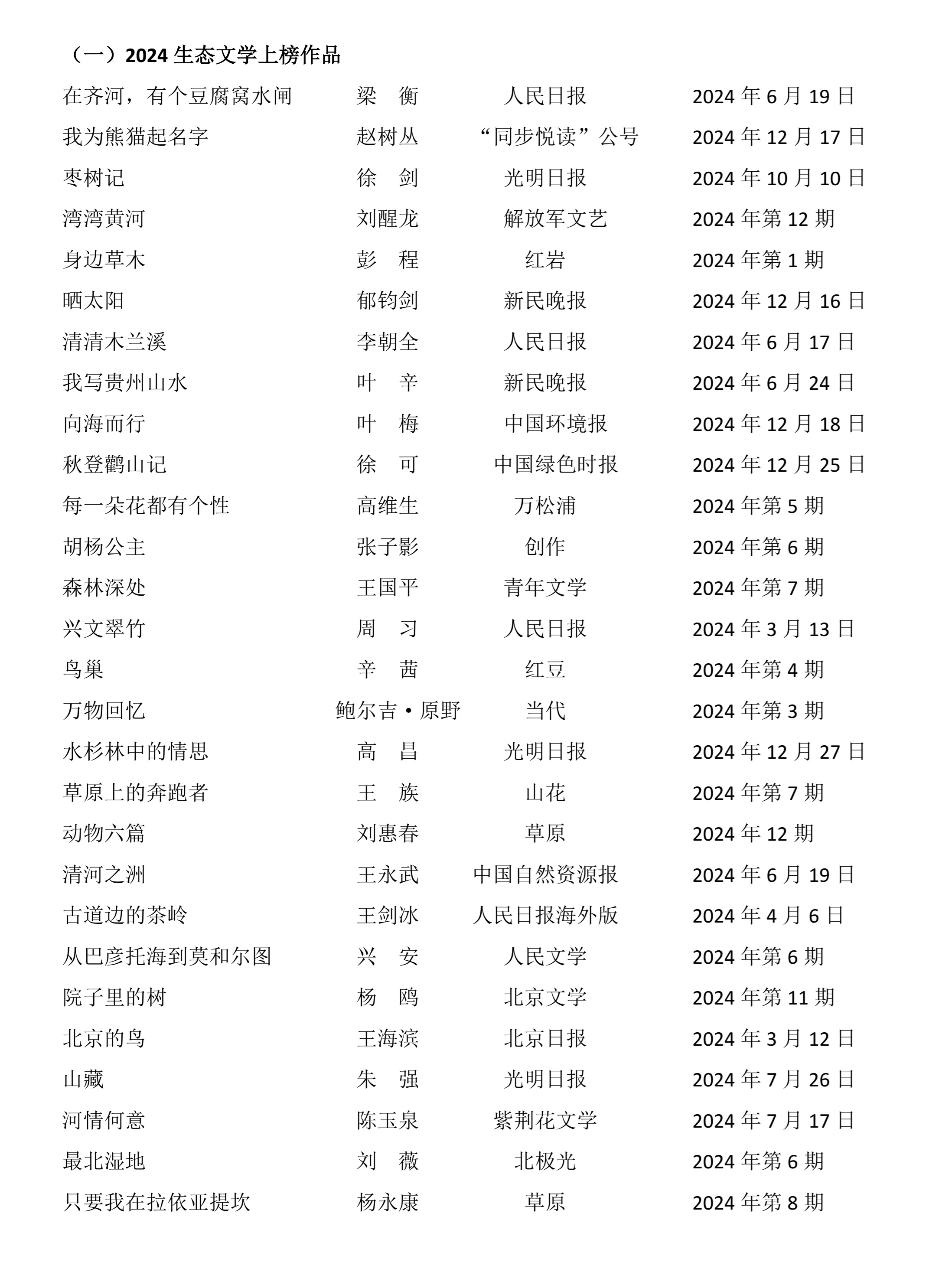 12月28日,由《今日国土》杂志社、今日国土生态文学委员会、房山区生态环境局、房山生态文联共同主办的“今日国土2024生态文学年会”在北京市房山区智慧长阳美术馆举行。年会审议通过了日前专家团评选产生的“中国2024生态文学榜单”。上榜作品兼具生态性、科普性、思想性、艺术性、亲历性,呈现了新时代生态文学的多彩样貌和万千气象,代表2024年度中国生态文学的水准和高度。