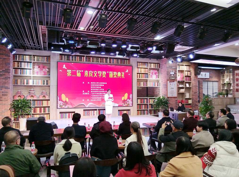 2024年12月28日晚,来宾市第二届“来宾文学奖”颁奖典礼在来宾书城举行。中共来宾市委宣传部常务副部长熊爱武,来宾市文联党组书记、主席覃维华,壮族作家创作促进会会长黄鹏,来宾市文联副主席吴智球、荣斌和吴胜恩等领导嘉宾及来宾作家、文学爱好者50多人参加颁奖典礼。