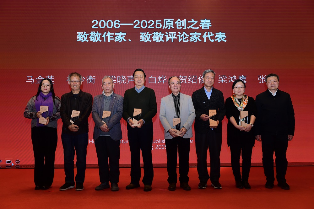发布会现场,湖南文艺出版社还向这二十年来在“原创之春”新书发布会上发布过作品的作家,以及参与过活动的评论家致敬,授予六十余位作家“2006-2025原创之春·致敬作家”荣誉称号,授予近三十位评论家“2006-2025原创之春·致敬评论家”荣誉称号。作家梁晓声、杨少衡、马金莲,评论家白烨、贺绍俊、梁鸿鹰、张莉作为代表到场领奖。