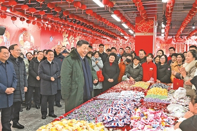 沈阳大东副食品商场历史悠久,富有特色的年节商品琳琅满目。23日上午,习近平来到这里,察看多家店铺,频频同店主和顾客交流,详细了解节日期间市场供应情况。大家见到总书记都十分激动,连声欢呼“总书记好”!习近平对大家说,“菜篮子”、“米袋子”、“果盘子”是民生大事,现在物质丰裕,过年团圆更要让大家吃得好、吃得健康。