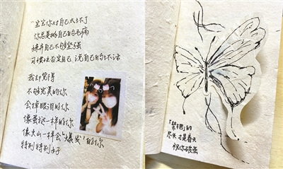 在金鱼送给朋友的手作书中,有一页与“蝴蝶”有关。褶皱的纸张上,一只立体感的手绘蝴蝶颤动着翅膀,好像要向书页外挣脱。金鱼在这一页的左下角写道,“禁锢的尽头才是春天,祝你破茧。”金鱼很喜欢蝴蝶的各种寓意,尤其是自由以及破茧成蝶的勇气。“她有时候会和我说自己不自信的一面,我希望她能像蝴蝶一样成长和蜕变,因为她像蝴蝶一样美好。”金鱼说。