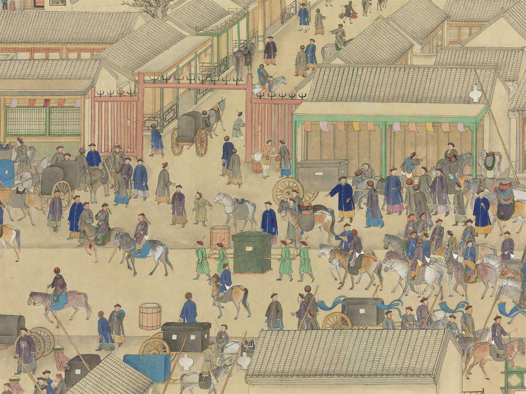 乾隆二十六年(1761)元旦,观象台钦天监观测到罕见的“日月同升,五星联珠”天文奇观,预测该年“海宇晏安,年榖顺成”,因此皇帝命徐扬(约1712-1777)绘图记录。《日月合璧五星联珠图》画中除了绘制观测到天文吉兆的观象台,也详细记录了正月初一文武官员进京朝见皇帝拜年及百姓的拜年活动,呈现城市节庆的风俗。