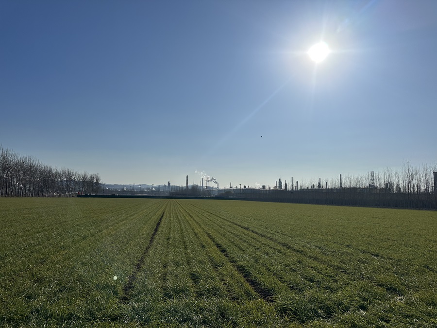 村子里的麦地,远处为当地工厂