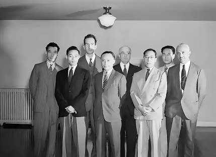上世纪四十年代,美国国会图书馆东方部主要馆员合影,左一为王重民、左四吴光清、左五为恒慕义。