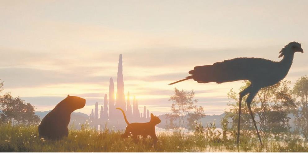 当然,《猫猫的奇幻漂流》最大的吸引力也不在于这些简明的隐喻和解读,它没有深刻复杂的寓意,但是,它呈现了深刻、壮观的美。导演说,在这个故事里,拉帮结派的蛇鹫帮和不知感恩的狗群都不是“反派”,如果一定要界定“反派”,那就是恐怖的自然之力,那一股没有任何生物个体能抵抗的、毁灭性的力量。电影所呈现的,正是面对“天地不仁”,在毁灭和生存的缝隙里,仍然能看到超越生死、与时间同存的美。在野蛮生长的森林里,人类活动留下的废墟是美的,夕阳下的巨大雕塑是美的,半淹没在水中的宫殿和城市的遗址是美的;洪水无情上涨,高山成为小岛,在如血的夕阳里,庞然巨鲸跃出水面,这个画面是悲凉的,但也是美的;甚至,暴风雨肆虐的黑夜,巨浪打散无数舢板,高山沉入水下,这场景是可怖的,但这摧枯拉朽的场面在影片的分镜里,仍然是美的。自然的洪荒之力不可对抗,这群弱小的动物们在摇摇晃晃的帆船上,不知道死亡和明天哪个先来,但是它们抬头看到灿烂的晚霞铺满远近的水面。