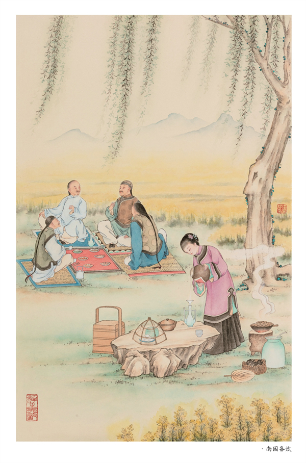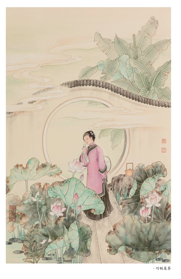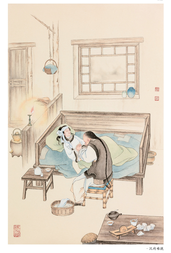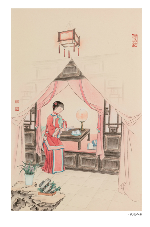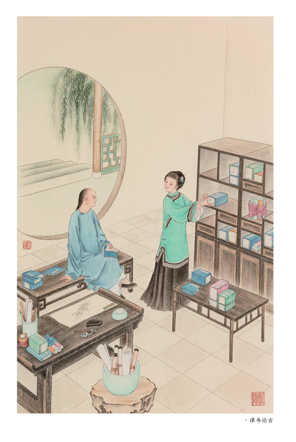 这套图断断续续画了四五年,本想去苏州、无锡实地考察一番,但因身体和疫情原因一直未成行,中间生病又中断了一段时间,几次易稿。期间北京大学教授朱玉琪先生和中国人民大学国学院教授孟宪实先生看过后,提出希望有别于《红楼梦》,更应侧重于市井平民化的意见,有些部分进行了修改或重绘。老朋友章慎生先生去苏州出差,拍一些苏州风貌的照片发给我作素材参考。画稿还得到了中国工笔画学会原常务副会长、《红楼梦》邮票设计者萧玉田先生的指导。老先生对一些构图细节进行了指教,我受益良多。中国红楼梦学会会长张庆善先生,多年来一直在工作和学习中给予我支持关照,也见证了我的成长,对于这次的作品,提出了中肯的意见,并答应帮我写序言。我特意请沈阳大学文化传媒学院的孙熙春师弟为此书篆刻印鉴两方,一方为“浮生六记”四字,一方为冯老《枕上再题曹雪芹家世》诗中的一句“楝树花开终结子”作为终结。另外我爱人王金亮先生,对我大力支持,承担了家里的一应事情,使我能心无旁骛地专心做事。