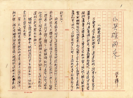 历经半个世纪,《小英雄雨来》手稿整体保存很好,作者管桦用蓝黑墨水在“25×20=500”的红色竖排格纸上创作,修改处并不多,共57页、21章。从最后一页可知,该稿并不完整。家属介绍,这部手稿是管桦在新中国成立后创作的,但这是第几稿他们也并不很清楚。