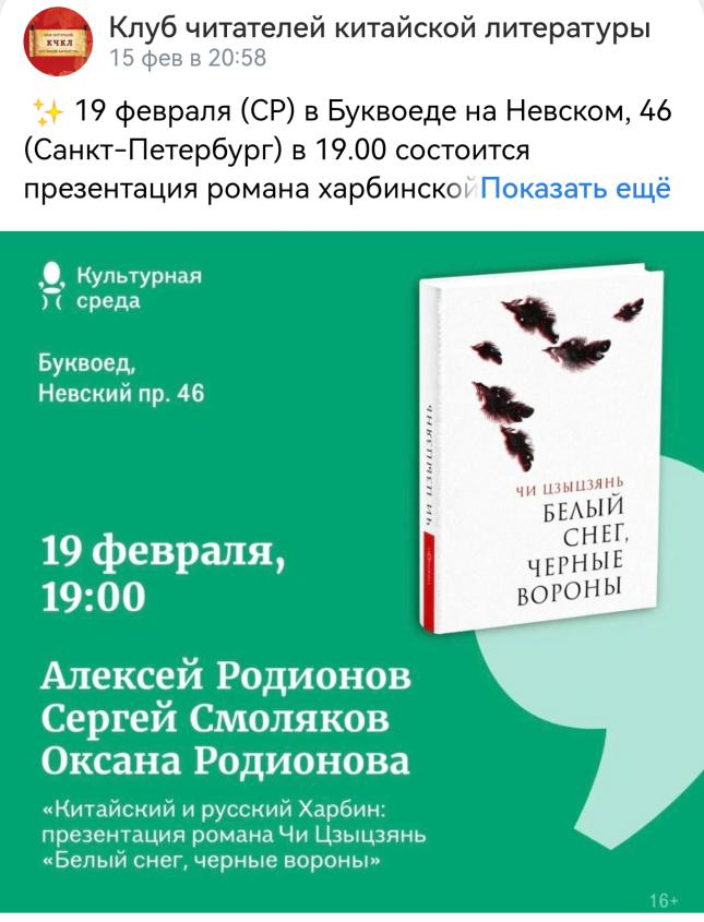2025年2月19日,中国著名作家、中国作家协会副主席迟子建的长篇小说《白雪乌鸦》俄文版推介会在书虫连锁书店圣彼得堡总店成功举行。本次活动由中国作家协会外联部指导,俄罗斯中国文学读者俱乐部主办,吸引了圣彼得堡各界30余位中国文学爱好者到场参与,同时通过网络直播向全国读者推介。