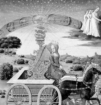 到了文艺复兴时期,对天空的描绘和对星座的痴迷在艺术家群体中更为盛行。被称为“人文主义之父”的彼特拉克是意大利诗人和人文主义学者,很少有人关注的是,他同时还是一位技法卓绝的画家,在寓意体长诗《凯旋》中他就加入了自己的画作。在一幅名为《时间的凯旋》的插图中,太阳在满天繁星中运行,横跨天空的黄道带上绘制着十二星座的对应图符,这是一个并不符合实际情况的想象性描绘,表达了人类的辉煌与天空中众星的狂欢。