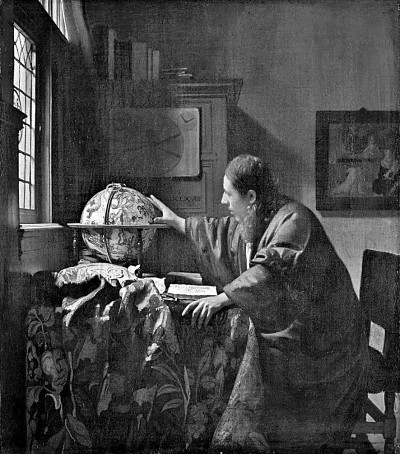 彼时的艺术家们对天体包括对地球本身都充满了极大的研究兴趣。以“荷兰小画派”的代表画家维米尔为例,他在光学、制图学、音乐、地理学和天文学等领域都有渊博的知识积累。绘制于1668年的油画作品《天文学家》,从命名上就体现了他对当时先进科学技术的关注。也是在启蒙运动时期,绘画作品中出现彗星的场景不再伴随着人类的惊惧、疾病与死亡。相较于托勒密时代所认为的不详预兆,彗星在1705年得到了天文学上的正名,哈雷发表《天文学对彗星的简介》,将其解释为一颗具有周期回归特性的天体。所以在另一位荷兰画家利弗·弗斯舒尔绘制的油画《鹿特丹上空的1680大彗星》中,一颗从天而降的彗星出现于鹿特丹上空,城市中的人们并未惊慌失措,而是井然有序地驻足观望,甚至拿起了手中的望远镜观察。