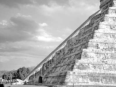 在美洲,古玛雅人不仅为后世留下了复杂的文字体系,其天文和历法系统也十分成熟,这在古玛雅建筑中有直观的体现。古玛雅的城市建筑包括宫殿、天文观测台、金字塔神庙等。在墨西哥尤卡坦半岛玛雅遗迹奇琴伊察的中心,有一座玛雅文明鼎盛时期的金字塔建筑,即卡斯蒂略金字塔(也称为库库尔坎金字塔)。它是祭祀羽蛇神的神庙,羽蛇神在古玛雅文明中是太阳的化身。该金字塔底座为正方形,四个坡面上的阶梯朝向正南、正北、正东和正西四个方向,四面的台阶各有91阶,加上最顶部的一层共计365个台阶,正好是哈布历(以365天为周期)中一年的天数。52块有雕刻图案的石板象征着玛雅日历中以52年为周期的轮回。每当春分与秋分日,日出或日落之时,金字塔拐角的轮廓在北面阶梯上的投影如同蛇身,与阶梯底部的羽蛇神头像正好相连,形成完整的蛇形图案,这一切显然都经过了精心的计算和设计。古玛雅人极为重视天文数据,金字塔的设计处处呼应天文和历法的数字规律,体现出古玛雅文明的宇宙观念。