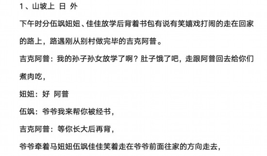 确定了场景后,演员们则开始商讨自己的表演,饰演伍飒妈妈的莫瑟阿妈说:“那我就干脆就这样坐着不说话?或者我干脆在这里假装缝补衣服算了。”于是,自顾自地从房子的主人家里借了针线,缝制起来。剧组联络员的儿子,也被喊来当小群演,就在众人商讨表演、台词时,这个小群演很认真地来回奔跑练习:“沙马爷爷,沙马奶奶,吉克阿普家杀猪吃,叫你俩上来坐。”