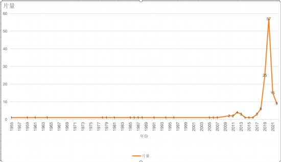 2021年底,我确定以凉山本土的影像创作为自己的研究方向,观察有关彝族的影像创作。截止到2022年笔者进入田野并进行资料整理时,发现当时凉山已经产生了大量彝族自我生产的、以母语电影为外壳、展现彝族人生活、传递自身价值观的影片,累计至少有149部,并且曾经呈现出增长的趋势(如下图),而为何会出现2021年这种暴增现象?这是当时的疑问。