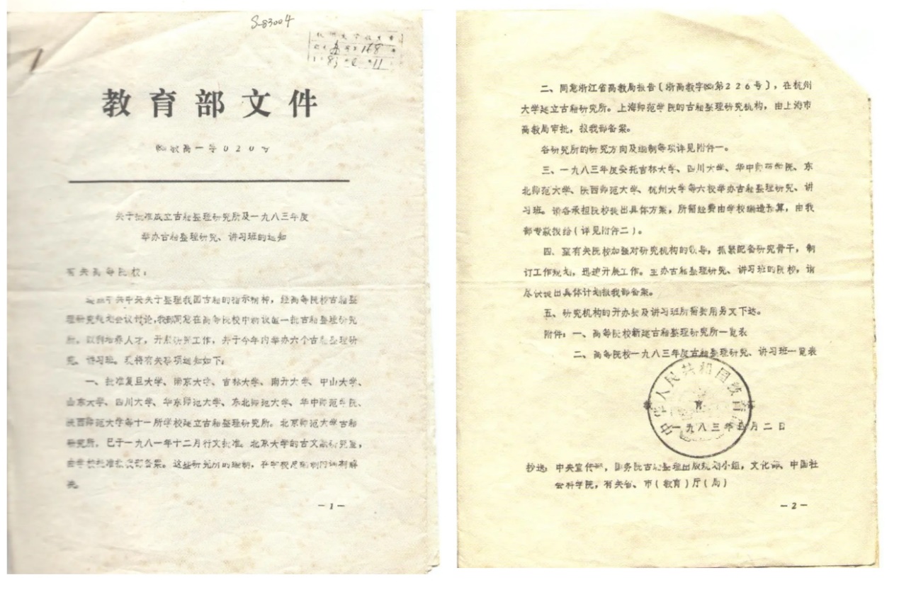 教育部副部长周林担任国务院古籍整理出版规划小组副组长后,在教育系统成立了全国高等院校古籍整理研究工作委员会,由周林同志兼任主任;1982年,教育部下发了经国务院核准的《高等院校开展古籍整理研究、培养整理人才的方案》,决定在全国有条件的高校成立若干古籍研究中心和增设古典文献专业。在这个背景下,杭州大学于1982年9月6日向浙江省高教局提出申请,建立古籍研究所,由姜亮夫先生任所长,编制20人。于是浙江省高教局向教育部递交报告,希望由教育部批准杭州大学古籍研究所。1983年4月2日,教育部以“(83)教高一字020”号文件,“批准复旦大学、南京大学、吉林大学、南开大学、中山大学、山东大学、四川大学、华东师范大学、东北师范大学、华中师范学院、陕西师范大学等十一所高校建立古籍整理研究所。”由于杭州大学不是教育部直属院校,所以教育部文件是“同意浙江省高教局报告(浙高教字(82)第226号),在杭州大学建立古籍研究所”。4月18日,杭州大学古籍研究所挂牌成立。