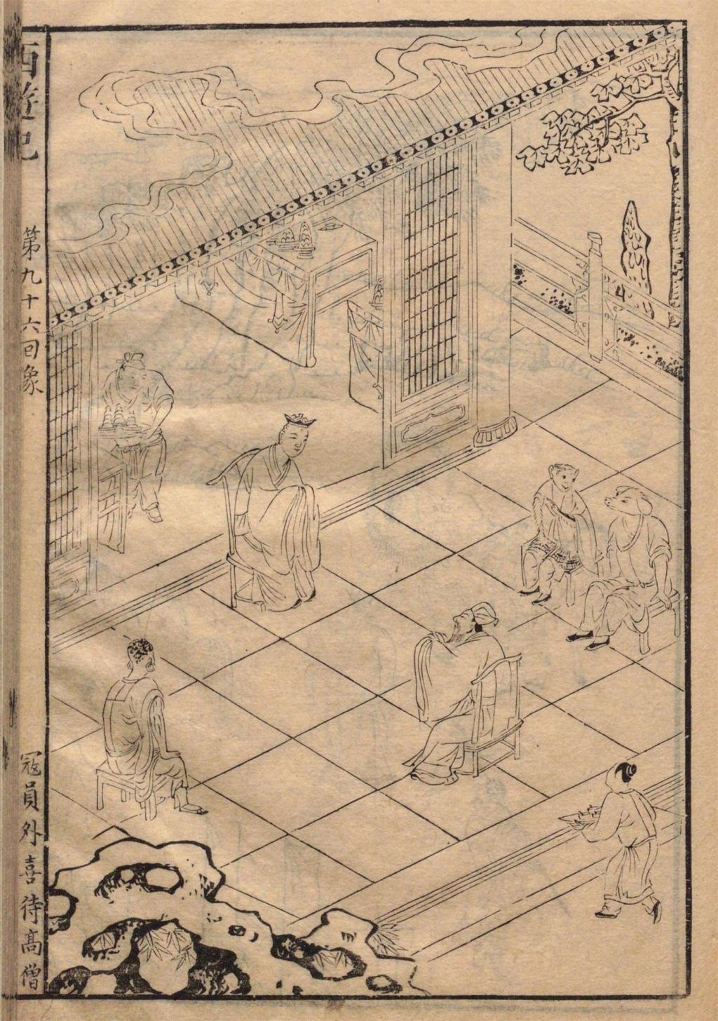 第96回 寇员外喜待高僧 唐长老不贪富贵。《李卓吾先生批评西游记》,可能是明万历时期金陵大业堂刻本,书前版画191。