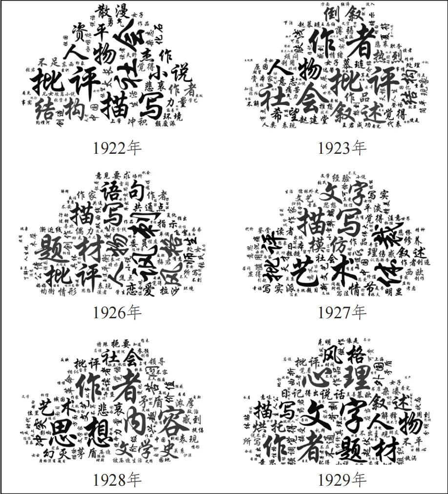 第一,批评注重文学本体。由图1可以看出,发轫期的小说批评注重文本本身,呈现出不受任何话语权利支配的更为纯粹的批评场域。这是批评的内在要求,也是20年代的时代语境与文学观念之下批评者的自然选择。纵观这一时期在文学本体批评方面的词云,1922年呈现出“描写”“人物”“结构”;1923年则呈现出“人物”“叙述”“倒叙”“结构”;1926年有“讽刺”“题材”“描写”“人物”“风格”“语句”;1927年则有“描写”“艺术”“体裁”“文字”“模仿”“叙述”;1928年显示“思想”“内容”“文学史”;1929年则显示“文字”“心理”“题材”“人物”“描写”“风格”“叙述”“烘托”等。这些论题词都与文学本体批评有关,注重长篇小说的题材、结构、艺术、语言、人物形象、写作手法等。这其中又以“人物”为高频词,呈现出小说的人物形象为发轫期的批评聚焦点。如(汪)倜然认为《爱的刑场》的两个主要人物个性相反,使得“故事错综有趣”(1);毛一波认为《灭亡》里的杜大心与阿志巴绥夫描写的人物相似(2)。