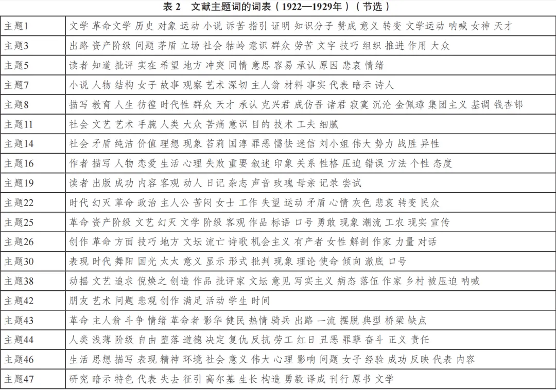 第二,立场重于艺术的左翼批评范式现出端倪并形成初步的政治批评场域。这一点我们通过考察作者发文量统计中占据第一的钱杏邨及其他左翼批评家的批评文献可以得知。鉴于下文使用到钱杏邨与茅盾的批评文献主题词,也因篇幅所限,因此表2以他们两人的文献主题词为主,对完整的词表进行了节选。根据主题的概率分布从大到小排序,钱杏邨文献内容的前10个主题分布为:26、16、30、46、22、5、38、25、19、47,由之考察钱杏邨的批评话语的特征,并对表1中批评频次较高的作品的文献(重点是与政治话语相关的批评文献)进行考察,又与表2中与政治话语相关的主题词进行相关对照,可以看出,钱杏邨急于确认革命文学在文学史中的地位,在批评史中建构了左翼的立场重于艺术的批评话语范式。