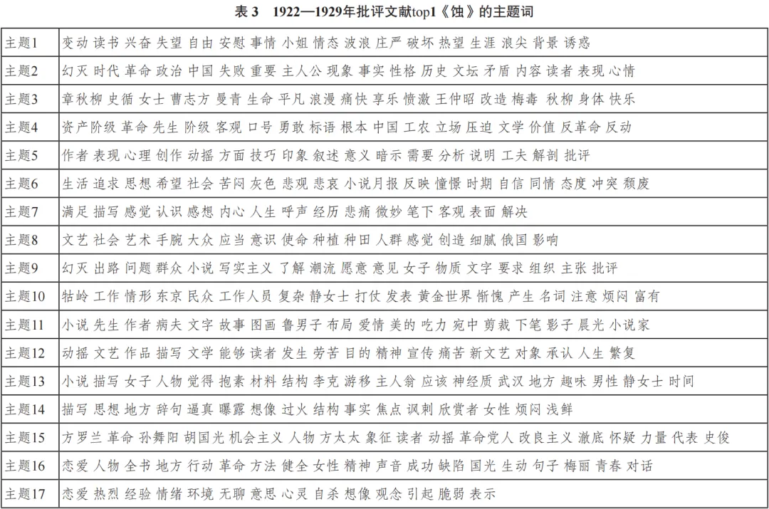 视野一,文本的时代性。根据自然语言处理技术的LDA主题模型,《蚀》批评文献的主题中根据词语的概率分布从大到小排序,共有17个主题(如表3所示)。