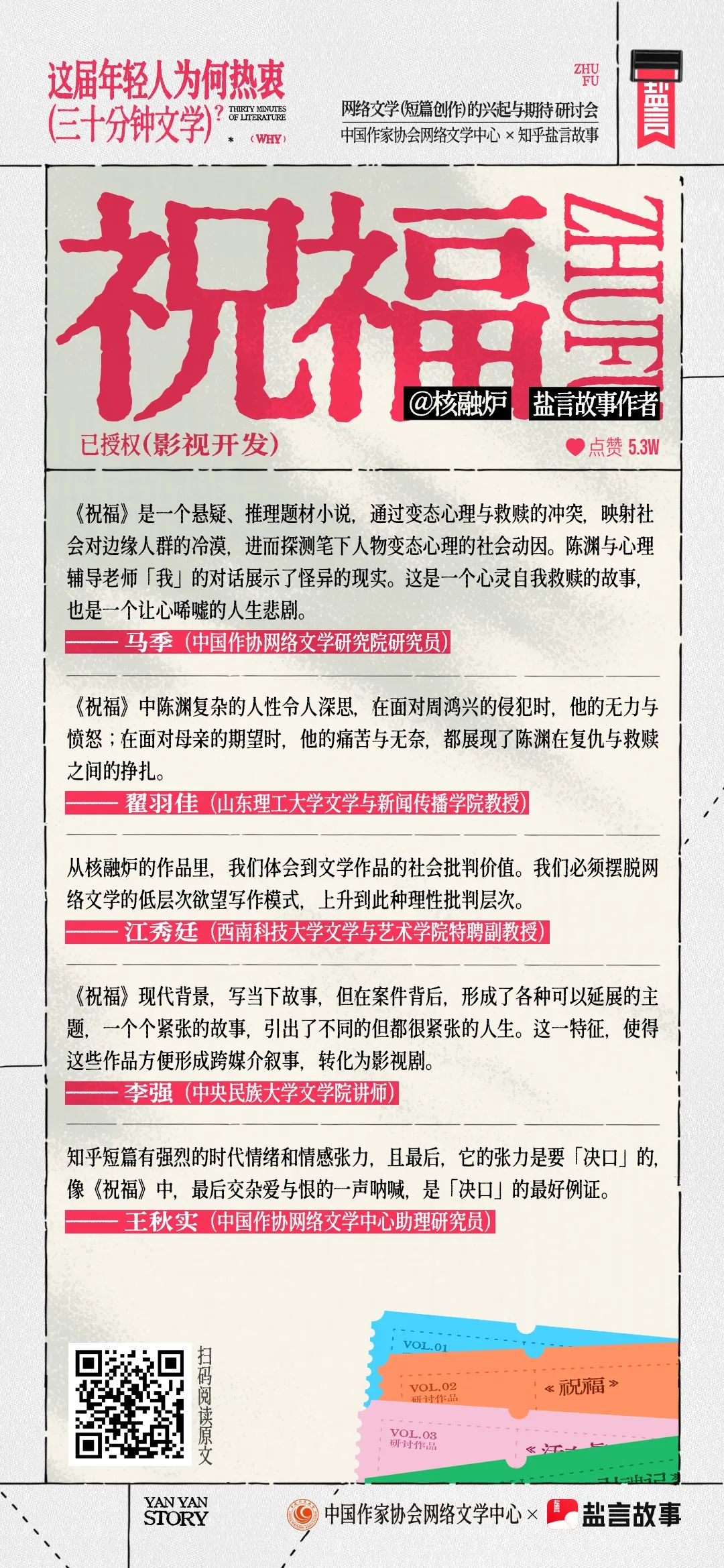 核融炉,1996年生。知乎盐言故事独家签约作者,擅长悬疑题材创作。代表作《无暇赴死》《最佳损友》《祝褔》《不可儿戏》《戏剧课》《迷雾》等,多部作品售出影视版权。《不可儿戏》获2024盐言故事短篇故事影响力榜“盐选好IP:最具影视价值”奖。短篇悬疑专栏《隐秘爱意游戏》位居知乎盐言故事悬疑口碑榜第一。出版短篇小说作品集《谋杀前夜》。