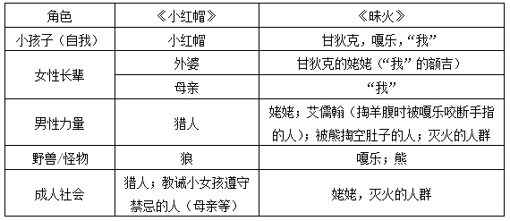 由于《昧火》对《小红帽》的改写可以说到了彻底颠覆的地步,其中人物所承担的功能也很难与《小红帽》中的人物严丝合缝地对应。二者的关联大致可以做如下对比: