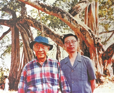 1991年春,张守仁老师与汪曾祺先生旅游云南期间,两人合影于一木成林的大青树下
