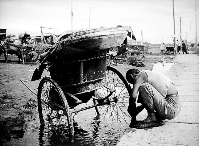 正在泥水里检查车胎漏气的车夫。虽然车况一般,但是比起打赤膊的车夫,这位车夫略显文明,穿着一件背心,腰上还系着皮带,从车厢上的铭牌能够看出来“周记 六十三”的字样。