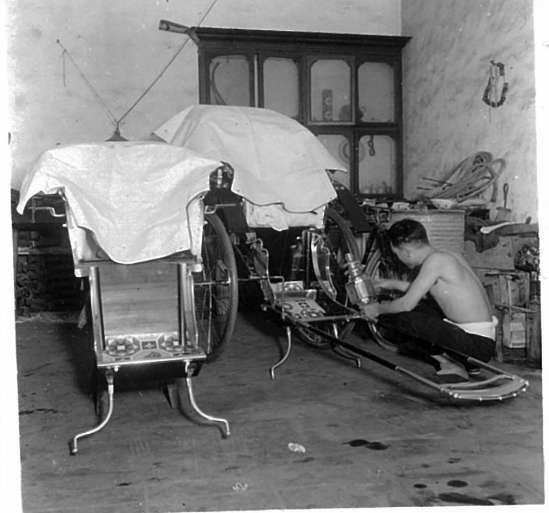 一个工人正在车行里制造洋车。