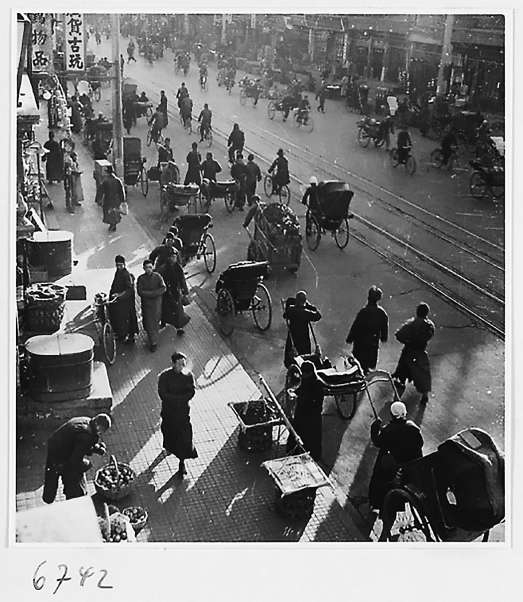 1933年,西单北大街行人、洋车、自行车交错。此时已通电车,人们对洋车的需求越来越低。