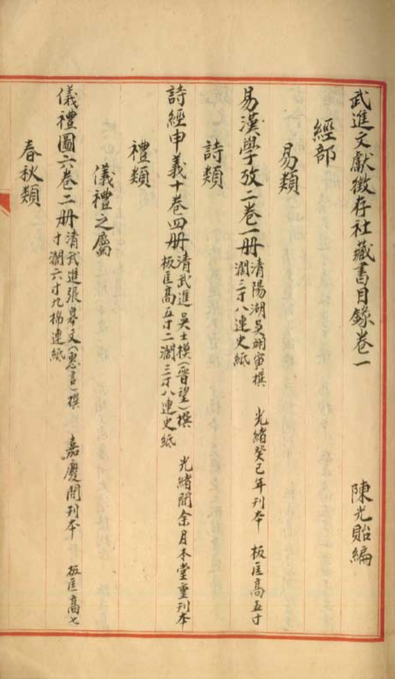 武进文献征存社的藏品到底有哪些?从《蒋维乔日记》中只知有书籍、甲骨文,详细名目无从得见。所幸陈光贻所编的《武进文献征存社藏书目录》稿本,完好保存在上海图书馆。此目写于半页十行的朱丝栏稿纸上,书前有凡例、总目。按凡例称,全目分类采用江苏省立国学图书馆法,略加增并,全书分为三卷,第一卷列朝乡先哲撰著书籍、稿本及有关武进文献的材料,第二卷全国古今学者著述书籍、稿本及丛书、杂志,第三卷文献、文物。卷一、卷二按经、史、子、集、丛五部分类,杂志附于卷二最后。卷三主要分为两类,文物是指商卜甲骨片,文献是指内阁大库要档。卷一、卷二两卷中著录的藏书,普通版本居多,偶有明刻本及清人稿本,据我所知张武曾《说文证异》稿本五卷有吴大澂题跋者、缪荃孙旧藏《咸淳毘陵志》旧抄本、赵烈文《落花春雨巢日记》稿本五册、赵烈文《能静居士日记》赵宽抄稿本五十四册、赵烈文《赵惠甫手札》手笺装裱本一册、钱大昕校跋旧抄本《大金国志》、沈廷芳旧藏清抄本《高丽国史》三十二册、旧抄本《杨大洪忠烈实录》三册等,现均藏于南京图书馆。卷二史部金石类自第一种《艺风堂金石文字目》至最后一种《续殷文存》共计七十二种,书名上方均画○,同样画圈的是卷三殷墟商卜甲骨片三宗: