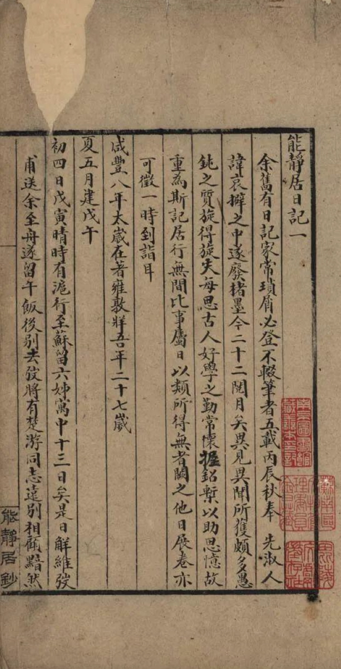 能静居士日记五十四册 清武进赵烈文(惠甫)撰 稿本 自咸丰八年五月初四日至光绪十五年六月二十止。惠甫二十七岁至五十八岁间日记。自咸丰八年至同治五年间书稿名“能静居钞”,每半页十行,直行格本。自同治五年十二月至光绪十五年六月,书稿名“亦龙亦蠖之居”,每半页十三行,方格本。两种皆毛边纸,未装钉。