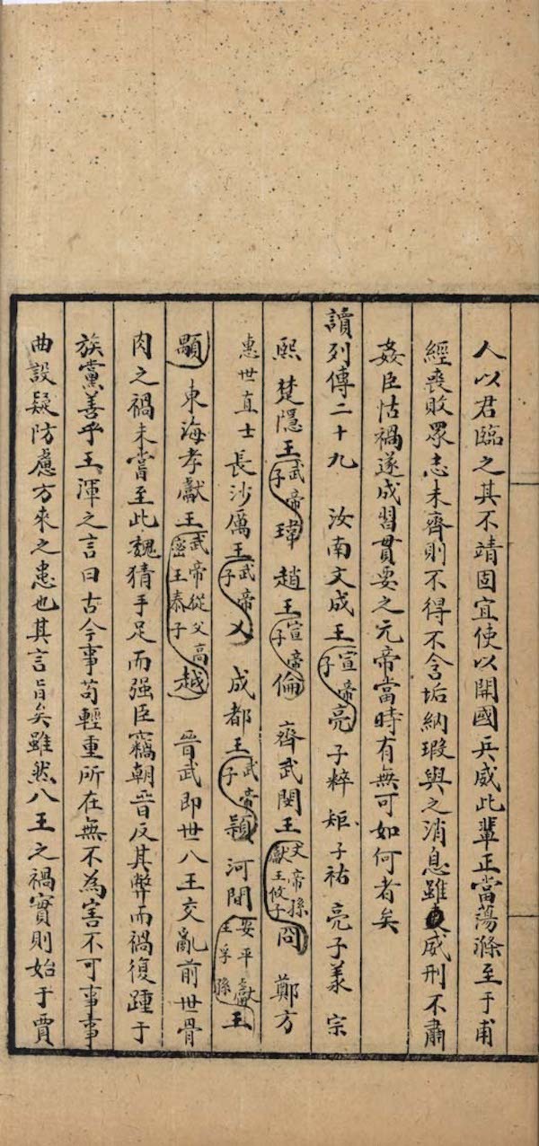 赵宽的校改,往往用墨笔直接施于日记正文的字里行间,如第十五册同治元年七月十八日“读《列传》二十九”,原抄作“汝南文成王宣帝子亮”“楚隐王武帝子玮”“赵王宣帝子伦”等,赵宽将小字夹注均勾乙到帝王名外(图3),检赵烈文手稿本即如此,应是抄手不明史书体例而误。还有直接改错字的,如第十七册将“郭芝仙”的“芝”字圈出,旁改为“芸”。最能证明南图此本不是赵宽所抄的直接证据,就是第十八册同治二年八月初六日的天头上,因为抄手漏抄了一大段赵烈文初五至初七日的读书内容,赵宽便在天头一一补抄,末了还不忘批了一笔:“以上散失,在初八日前,钞胥可恨!”(图4)以表达对抄写者的不满。还有一个旁证,第二十三册书根处,赵宽还写了“此册已前共计抄公应有本六千文还三元”一句,这明显是对抄写工价的记录。故陈文所云的“赵宽录副”恐怕不实,还是以笔者此前所称的“能静居钞本”较为稳妥。