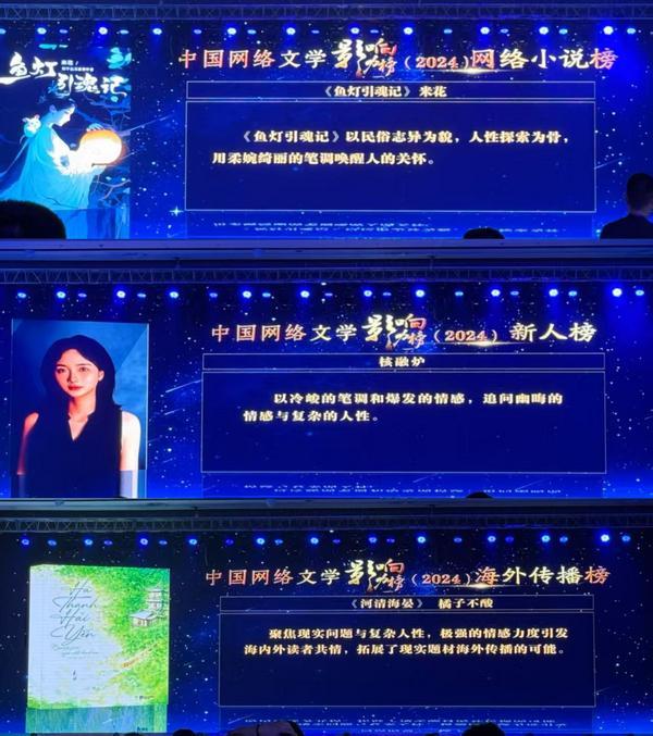 6月17日,“2024中国网络文学影响力榜发布仪式”在江苏盐城举行,中国作家协会网络文学中心现场发布了年度中国网络文学影响力榜,网络小说榜、IP影响榜、海外传播榜、新人榜四个子榜单一一揭晓。其中盐言故事同时斩获三项荣誉,米花的《鱼灯引魂记》入选网络小说榜,核融炉位列新人榜,橘子不酸的《河清海晏》则荣膺海外传播榜。