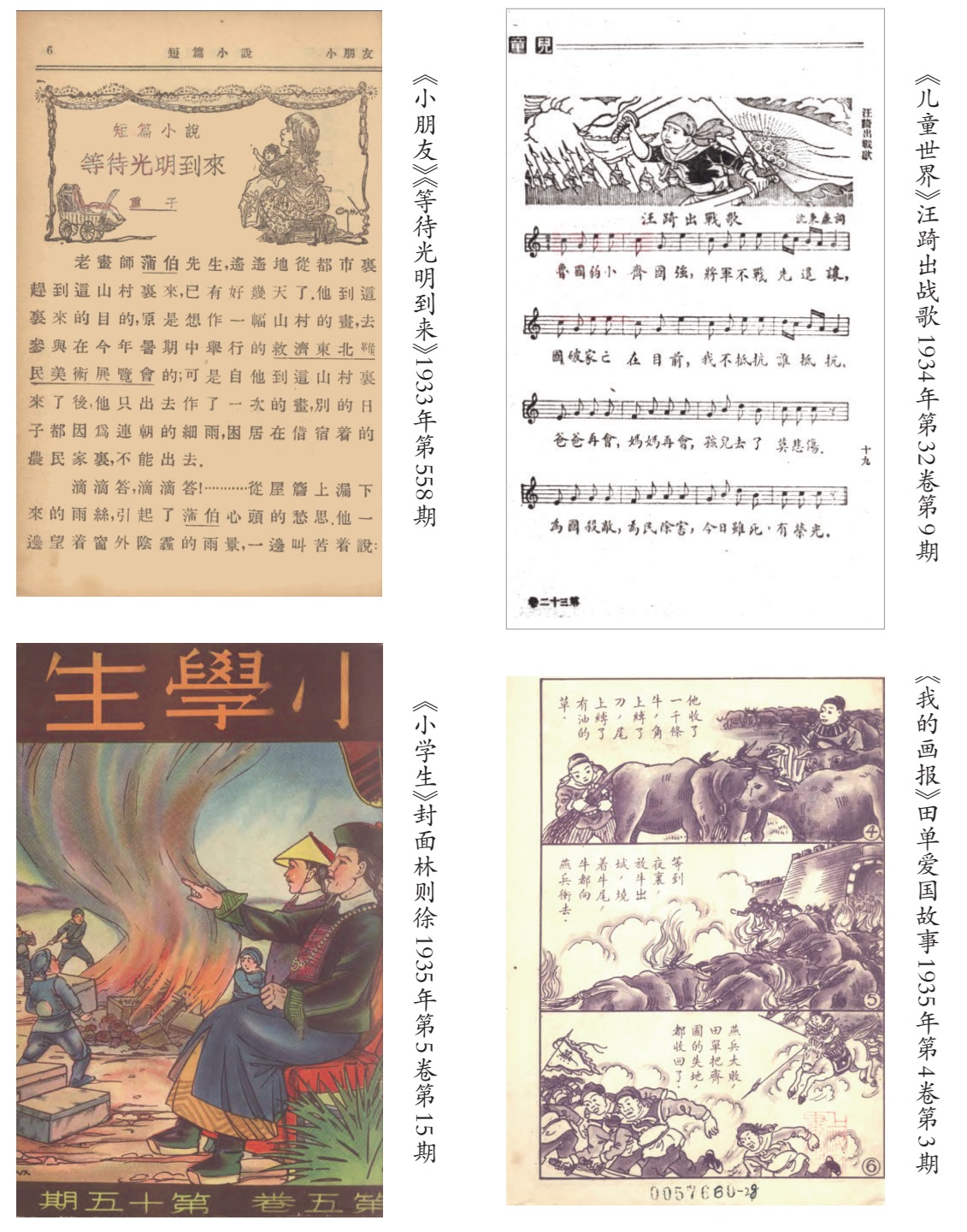 抗战时期(1931-1945)发行量最大、在全国知名度和普及度最广的儿童报刊如《儿童世界》(商务印书馆)、《小朋友》(中华书局)、《小学生》(北新书局)、《新少年》(开明书店)、《我的画报》(新中国书局)等,都依托自己的刊物特色,塑造了各种“抗敌英雄”形象。将这些英雄形象分类,可以分为“历史上的民族英雄”和“文学中的抗敌小将”两大类。