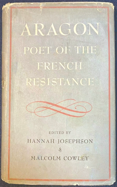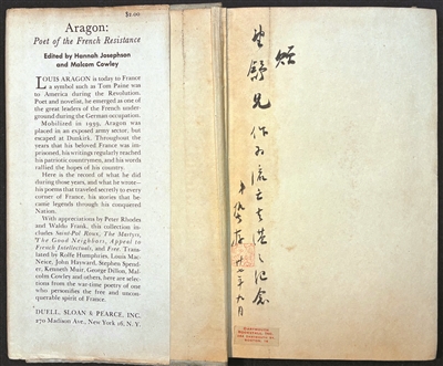 在施蛰存先生送给我的外文旧书中,有一本《Aragon: Poet of the French Resistance》(《阿拉贡:法国抵抗诗人》),Hannah Josephson和Malcolm Cowley编,纽约Duell, Sloan and Pearce一九四五年初版二刷。路易·阿拉贡是法国超现实主义诗人,二战期间成为沦陷法国的地下抵抗运动领袖。书的前衬页的左侧,有施先生毛笔题词:“赠望舒兄:作为流亡去港之纪念。弟蛰存,卅七年九月。”