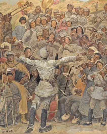 战争可以摧毁肉体,却不能夺走对精神家园的守望。而这份坚韧,终将使人性的火种于战争的铁血洪流中得以顽强存续,并转化为民族不屈不挠、勇往直前的澎湃动力。在抗战美术画卷中,还有另一种重要笔触,记录战争至暗时刻里的光明心火,以见证黎明必至的希望和梦想。如邢庆仁的《玫瑰色的回忆》和高云的《还记得我们吗》两幅作品,都刻画了年轻的八路军、新四军女战士。她们身姿挺拔,戎装陈旧却整洁,充满活力与憧憬,特别是军帽之下那些纷扬散落的碎发,如青春灵动的无声诉说,提醒人们纵使烽火连天,也不能掩盖她们花样年华的芬芳,更无法夺走她们追求美的执着。沈尧伊的《在太行山上》,描绘了军民共奏欢歌的动人场面。画面正中,一位八路军战士正在指挥大家演奏,其张开的双臂像要托起每个人的和平梦想。在此,乐器与武器并置、山谷与旋律共鸣,军民一起享受精神世界的丰饶。窦培高的《微山湖上静悄悄》,捕捉了五位战士在芦苇荡中短暂休憩的场面。战士们有的凝望远方、有的弹琴吟唱、有的警惕四顾,但他们手中的枪和土琵琶都被微山湖的夕阳镀上了温柔的金色,正可谓:铁血与温情交织,剑胆与琴心并存。