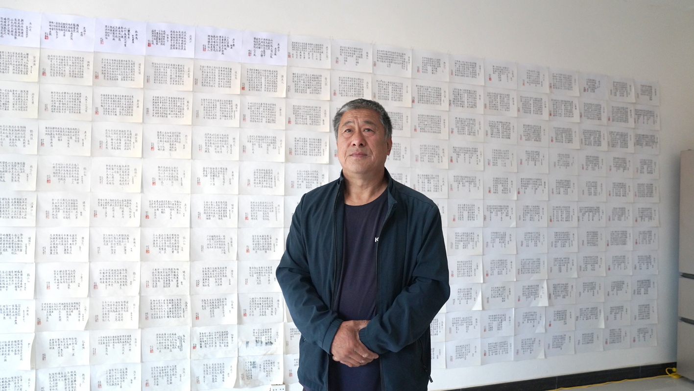 走进马建国家的小院门,迎面而来是一棵大杏树。杏树的左边,是一个矮小的厢房,而靠里则是一栋崭新的楼房。马建国指着新楼房一层最右边的屋子说:“这就是我展示诗词的地方。”走进去一看,整个屋子宽敞,四面墙壁都贴满了诗。这些诗作被马建国工整地抄在A4纸上,然后再一张张地贴到墙上。最顶端的那一组诗,明显是最近才贴上去的,因为这些纸张还保持着乳白色,而下半部分墙的纸张已经泛黄了。