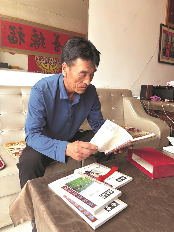 咸存福的家有一个四四方方的小院,院内绿树掩映。然而,步入略显简朴的客厅,屋内的景象却令人印象深刻。房间左侧,倚墙而立的是半面墙的书柜和一张书桌。桌上,一台笔记本电脑的触控板两侧,被长期使用磨出了两个极其醒目的油亮手印,无声诉说着主人的勤奋。与之相对的房间右侧,一个书架上整齐陈列着从第一届到第十届的所有茅盾文学奖获奖作品。面对记者,咸存福和他的父亲咸顺利分享了他们的故事。