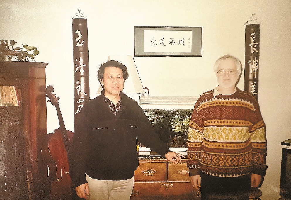 刘心武(左)1992年10月在挪威奥斯陆何莫邪家中与其合影