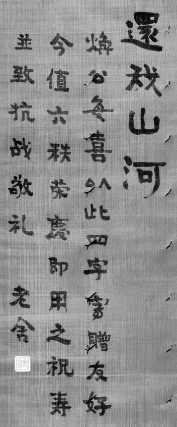 抗战期间,冯玉祥将军六十岁生日时,老舍书“还我山河”祝寿并致抗战敬礼。