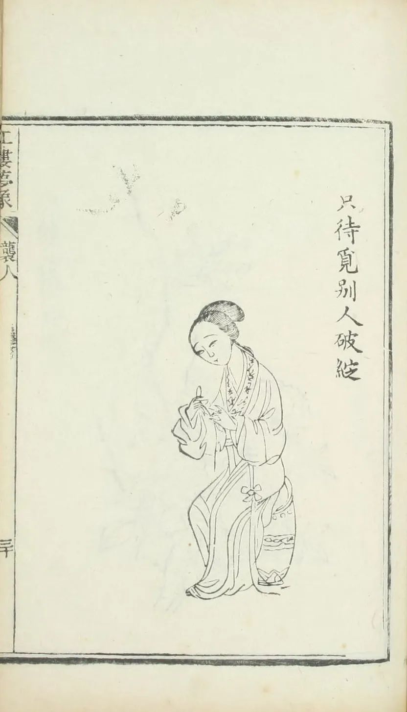 及此,心下不禁困惑,读花人为什么要用史上帝王将相来作比清俊女儿,分明是宝玉最嫌的须眉浊物,贾长沙、汉高祖、太原公子、子产、李令伯、杨德祖……人里的龙凤,才情出众,但还是为朝廷尽忠,宝玉极尽嘲讽的“文死谏武死战”,可不是玷污了这些女孩儿?是读花人另有衡器,脱不出现实社会的窠臼,所举人物全是青史留名,心中的真英雄,属读书人的局限性。然而,宝玉曾经遵父命,写下“姽婳将军”诗,称颂为王出征平靖天下的女子。按向来的原则,清清净净的女孩,沾了男子,便染上浊气,但此篇章出污泥不染,写出女子的英气,很有一番史湘云的风度,也像搜检大观园时候,探春和晴雯的杀伐果决。暗以为曹雪芹让宝玉写这命题作文,是为唱和之前黛玉的“五美吟”:西施、虞姬、昭君、绿珠、红拂,属正史的另一面。犹如湘云和丫头翠缕论阴阳,湘云说的“阴阳顺逆”,属辩证法,翠缕当然不解,却歪打正着:“开天辟地,都是阴阳了?”湘云再说:“‘阴’‘阳’两个字还只是一字,阳尽了就成阴,阴尽了就成阳。”这就是个太极图。翠缕哪里懂得这个,只说:“这糊涂死我了!什么是个阴阳,没影没形的。”湘云举例道天地,水火,日月。翠缕方才悟过来:“怪道人都管着日头叫‘太阳’,算命的管着月亮叫什么‘太阴星’,就是这个理了。”因此,“古今人孰似”,实是读花人眼中的水中倒影。
