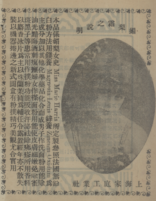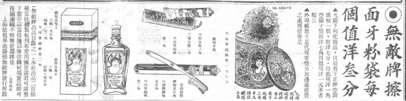 尽管家庭工业社积极在南洋开拓海外市场,但目前没有材料表明其产品远销欧洲,因此“法国里昂”之说无从考证。有意思的是,以上材料将媚梨霜与以化妆品著称的法国捆绑,不仅为家庭工业社营造出一种国际品牌的印象,更重要的还有税收减免的政策红利,这对一家正处于起步阶段的企业来说,不可谓不重要,因此“媚梨女史”定制可能只是一种营销的噱头。其实《申报》早在前一年就刊登过媚梨霜的广告,但是化妆盒身并没有西洋女子的画像(例如1921年10月4日),前述的国际化包装或许是为了打开销售局面才在后来推出的。