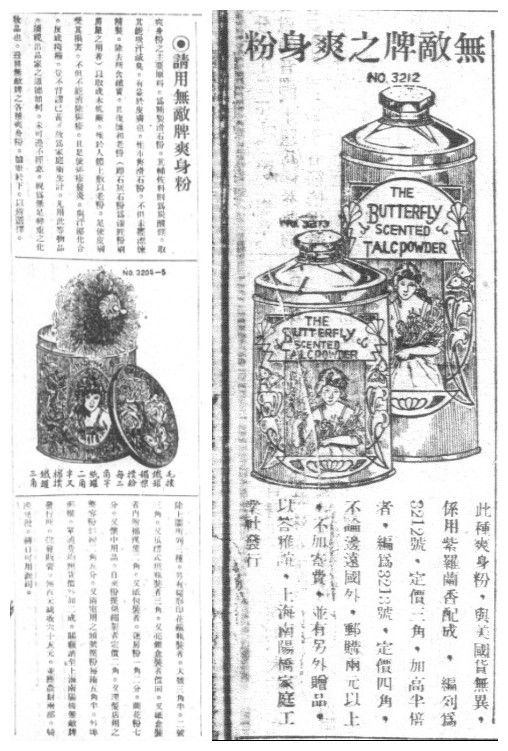 《紫罗兰之优待券》:瘦鹃生平,雅好紫罗兰花,特嘱天虚我生制成一种紫罗兰之爽身粉,浓香艳美,无以复加,爰经家庭工业社担任发行,以公同好,装用莲蓬式之美术铁瓶,上印Miss Marie Harris女史之七色照相,美丽绝伦,仍以蝴蝶为商标,定名为(无敌牌爽身粉)The “Butterfly” Scented Talc Powder。每瓶定价三角,如凭此券向购,祗收七折,实洋二角一分,大号瓶高六寸,定价四角,七折减[祗]收二角八分,邮费另加,每单纯费二角,可寄六瓶或大号四瓶,如寄十二瓶或大号八瓶,祗需邮费三角,惟边远倍费之处,照邮章加算。请与上海小西门新马路家庭工业社或棋盘街著易堂购取可也。(1923年7月18日)