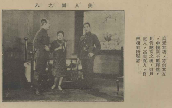 图9 《美人关》剧照之一,展现高人杰、胡媚梨、尚剑帆的三角关系(图片来源:《明星特刊》1928年第29期)