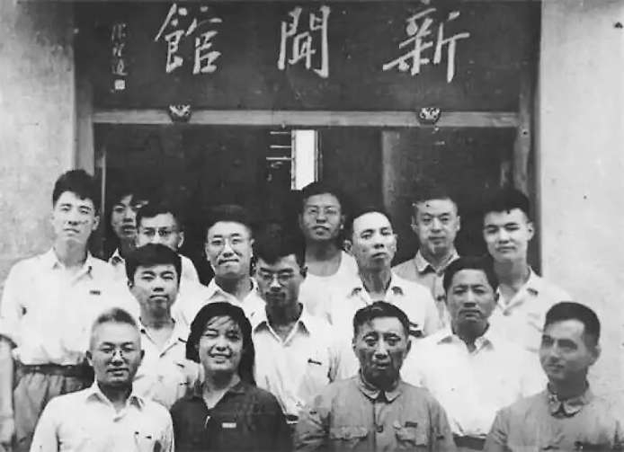 1952年,陈望道先生(前排右二)与复旦大学新闻系教师在新闻馆前合影