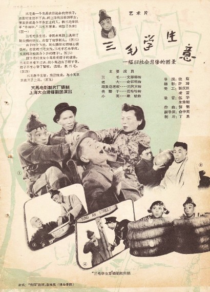 大众滑稽剧团创作排演的《三毛学生意》,主要人物借意于张乐平笔下的流浪儿三毛,由传统独脚戏《剃头店》《瞎子店》等串连而成,前后情节的“割裂感”比较明显。这出戏的最初版本,把三毛塑造成苏北农村来到上海的呆笨小丑,处处受人戏弄,愚昧可笑,出尽洋相。后经几度修改打磨,将讽刺锋芒指向旧社会的黑暗势力,挖苦嘲弄的对象为作恶多端的地痞流氓和剥削阶层,思想性与艺术性有所提升。